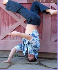 a one-armed handstand, arching limbo, or falling into